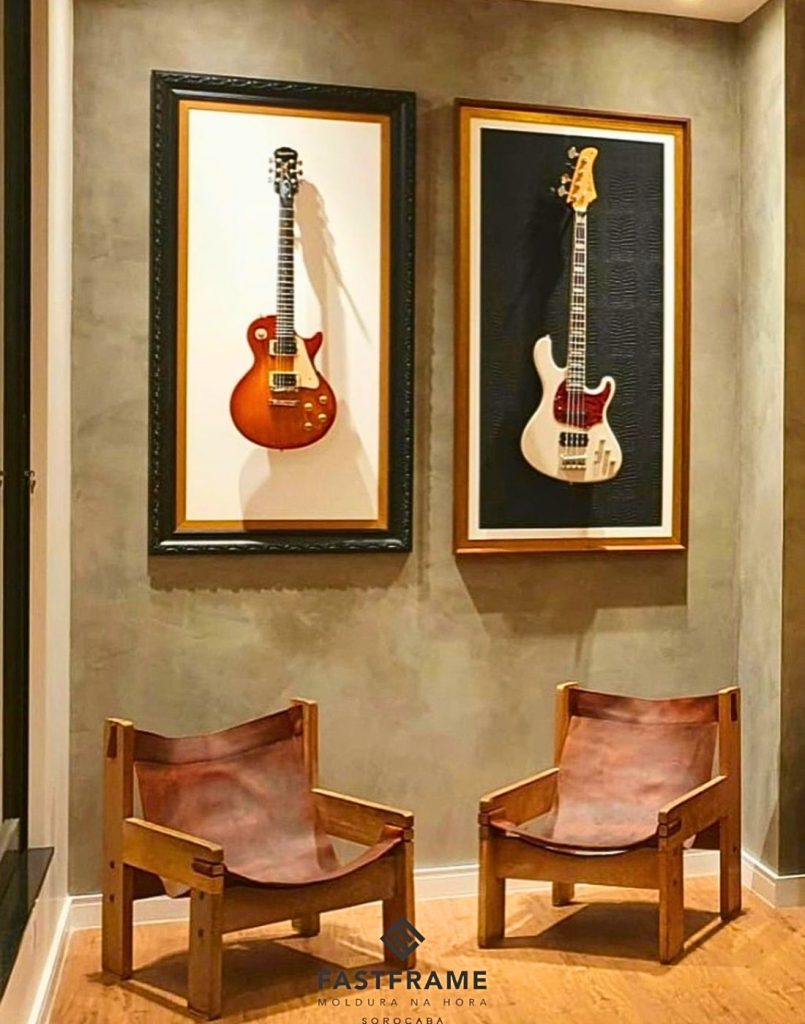 Um quadro de guitarra pode ser uma peça de arte incrível, deixando o ambiente elegante e cheio de personalidade.